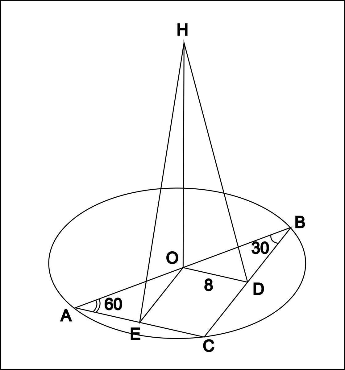 Прямоугольный треугольник с гипотенуза 32 см и острым углом 60 вписан в круг. Из центар О окружности к ее плоскости проведено перпендикуляр ОН. Найдите растояние от точки Н до катетов треугольника если ОН = 65см