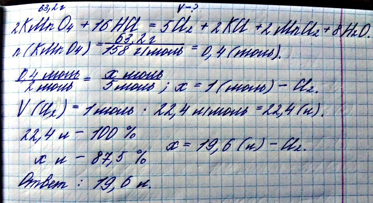 Какой объем хлора (н.у.) выделяется при взаимодействии 63,2 г перманганата калия с избытком концентрированной соляной кислоты, если выход продукта реакции составляет 87,5%?