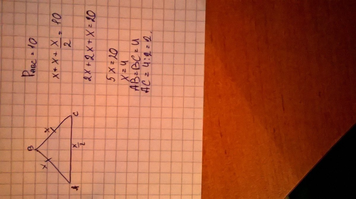ABC-равнобедренный треугольник, где АВ=ВС. Длина стороны АС в два раза меньше длины АВ. Периметр треугольника АВС равен 10см. Найдите длины сторон треугольника. с Дано и рисунком запишите плиз..)