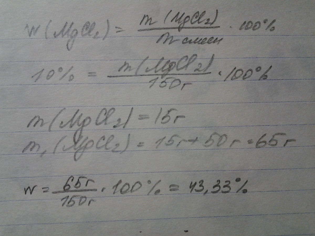 определить как изменится массовая доля хлорида магния в 10% в растворе массой 150 грамм,если добавить 50 грамм соли (с подробным решением) заранее спасибо)