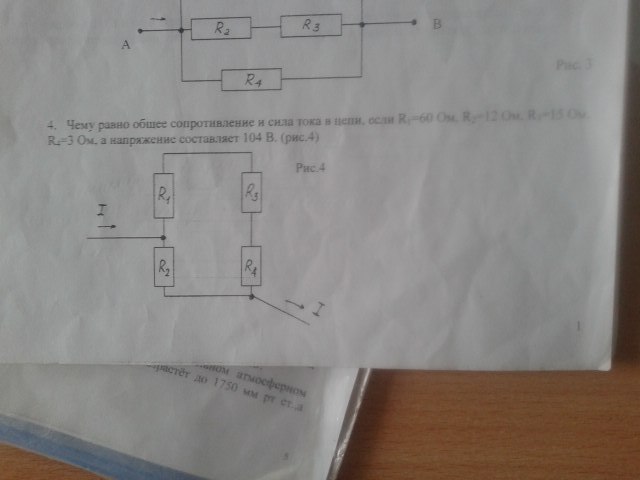 чему равно общее сопротивление и сила тока в цепи если R1=60 ом, R2=12 ом, R3=15 Ом, R4=3 ом а напряжение составляет 104 в?