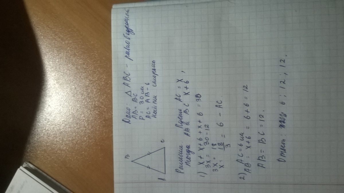 задан равнобедренный треугольник периметр которого 30 см. Найдите стороны треугольника если его основание на 6 см меньше чем длина боковой стороны