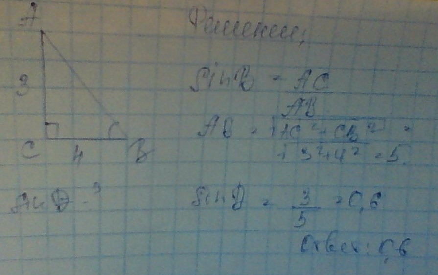 В прямоугольном треугольнике АВС (угол С=90градусов), АС = 3см, ВС = 4см.Вычислить sin B. ПОМОГИТЕ,пожалуйста.