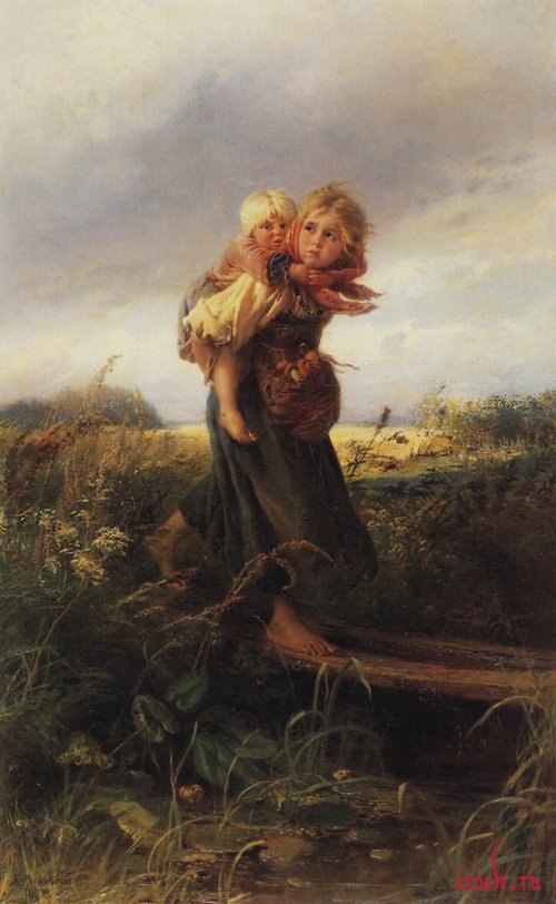 но сейчас мы посмотрим на их лица и увидим переживание, стремление бежать к чему-то лутшему, там где тепло и уютно. Девочка неся свою сестру, очень устала,но надо бежать дальше. Думает"намокнем под дождём, есть гроза значит будет ливень". Ветер колышит траву и греет своим холоданием её босые ноги.Но она бежала и на секунду остановилась посмотреть не прошла ли она. Девочка что всё будет хорошо, вернее верит этому, и я точно знаю что они дойдут до своей цели.