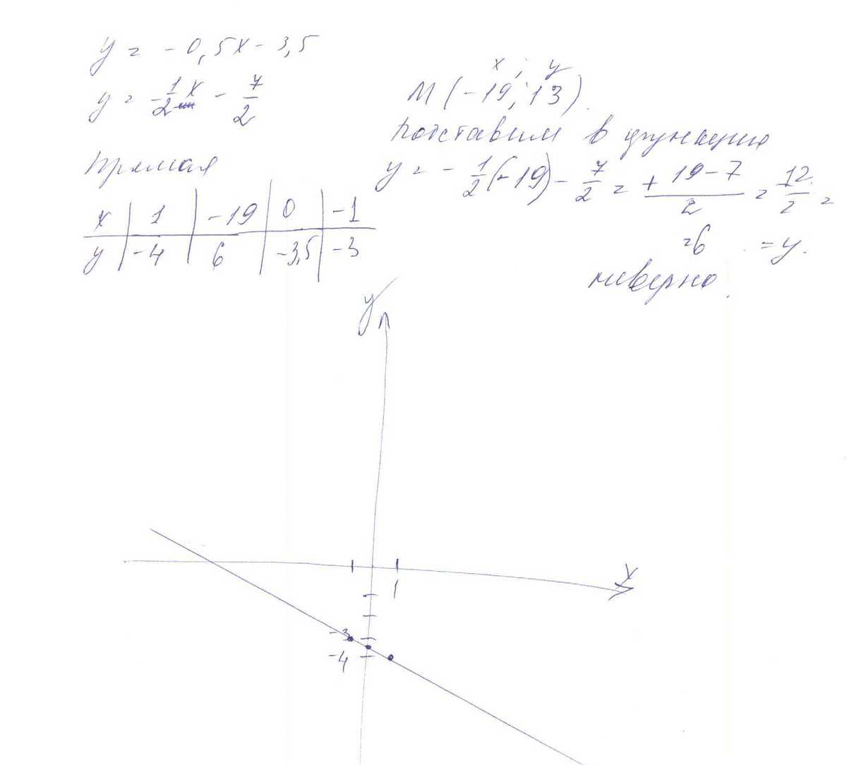 Постройте график функции y=-0.5x -3.5/ Выясните, проходит ли график функции через точку M(-19;13)(если можно то и график тоже покажите)