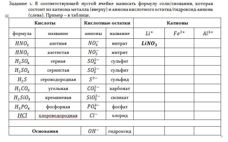 В соответствующей пустой ячейке написать формулу соли/основания,
