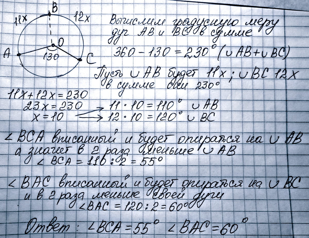 На окружности с центром в точке O взяты точки A, B, C так, что дуга AB относится к дуге BC как 11:12. Угол COA равен 130°. Найти углы BCA, BAC.