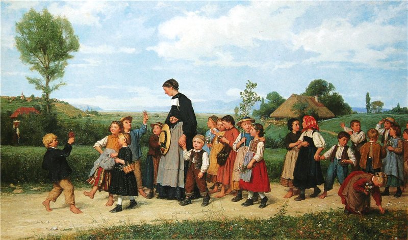 На картине мы видим женщину с детьми. Дети занимаются самыми разными вещами. Кто то разговаривает с женщиной, кто то бежит, кто то идет... Все Двигаются по сельской дороге. На улице хорошая погода. Дети довольные!