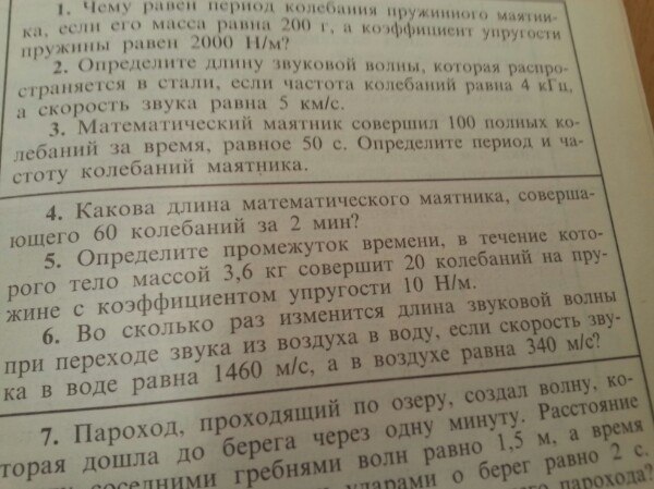 6. L = v/n, где n - частота звука (она одинакова для воды и воздуха)Видим, что длина волны пропорциональна скорости распространения волны в данной среде.L2/L1 = v2/v1 = 1460/340 = 4,3 раза.
