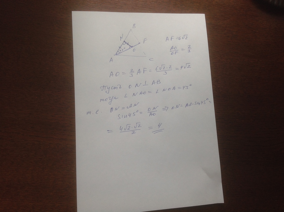 Условие: Длина медианы AF треугольника ABC равно 6 корень из двух см, а точка О лежит на AF так, что AO:OF = 2:1. Вычислите расстояние от точки O до прямой АВ, если градусная мера угла, образованного стороной AB и отрезком AF, равна 45 градусам.