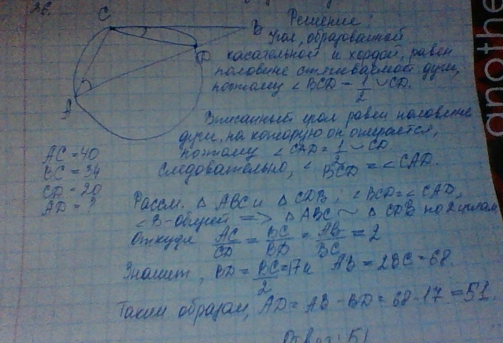 Окружность проходит через точки А и С треугольника АВС, на стороне АВ взята точка Д через которую так же проходит эта окружность. Прямая ВС является касательной к данной окружности. Найти длину АД, если ВС=34, СД=20, а АС=40.