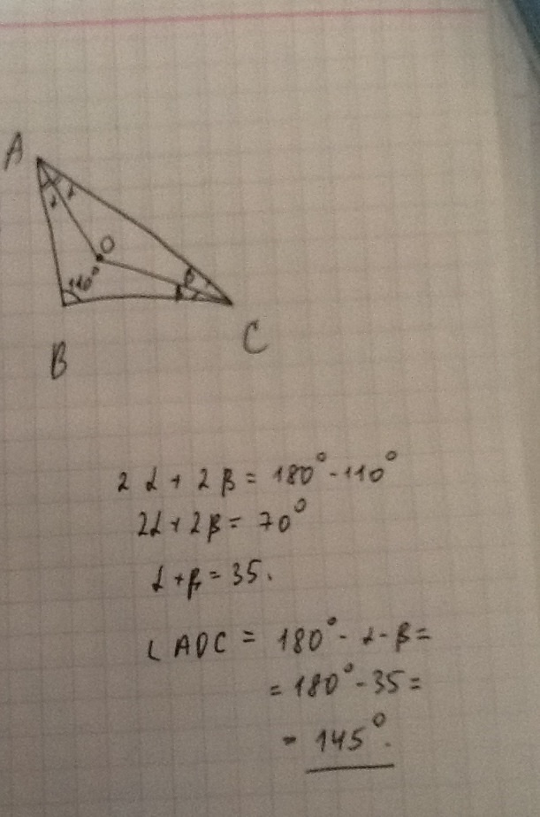 Помогите пожалуйста.В треугольнике АВС угол В=110градусов, биссектрисы углов А и С пересекаются в точке О. Найдите угол АОС.