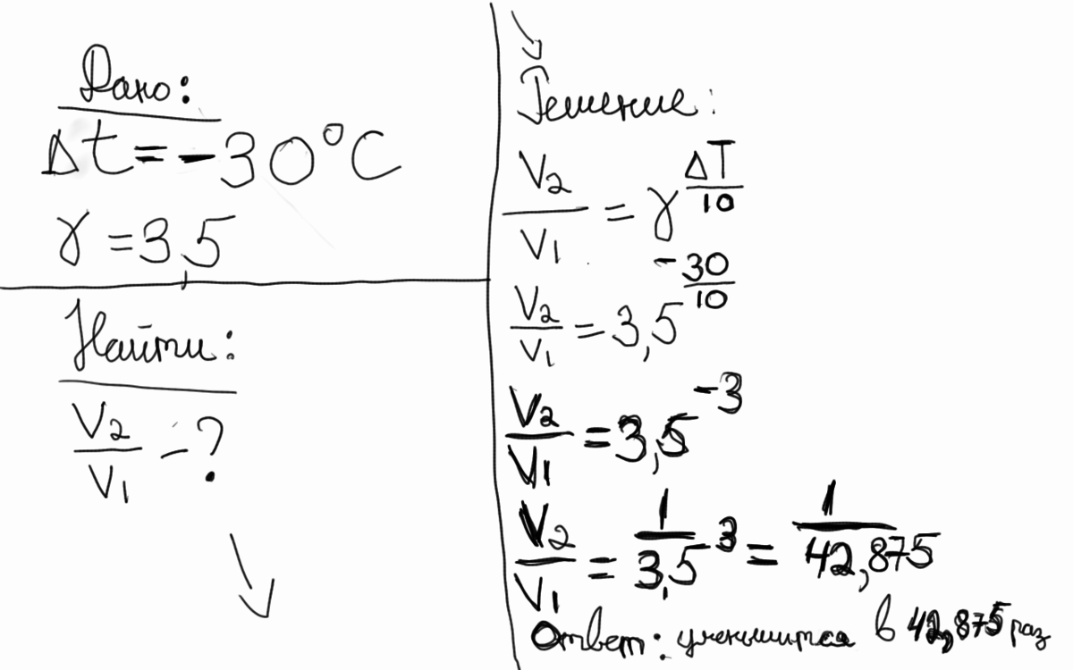 Во сколько раз уменьшится скорость химической реакции при понижении температуры на 30 градусов, если температурный коэфицент 3,5