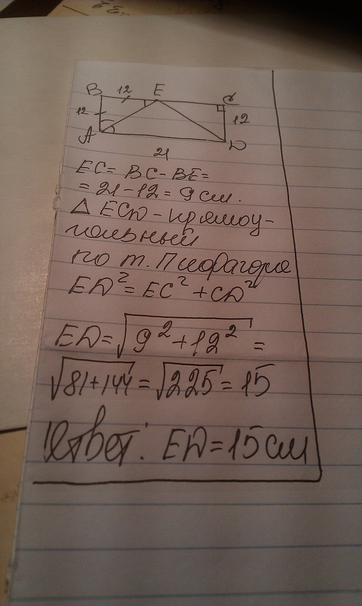 На стороне BC прямоугольника ABCD, у которого AB = 12 и AD = 21, отмечена точка E так, что треугольник ABE равнобедренный. Найдите ED