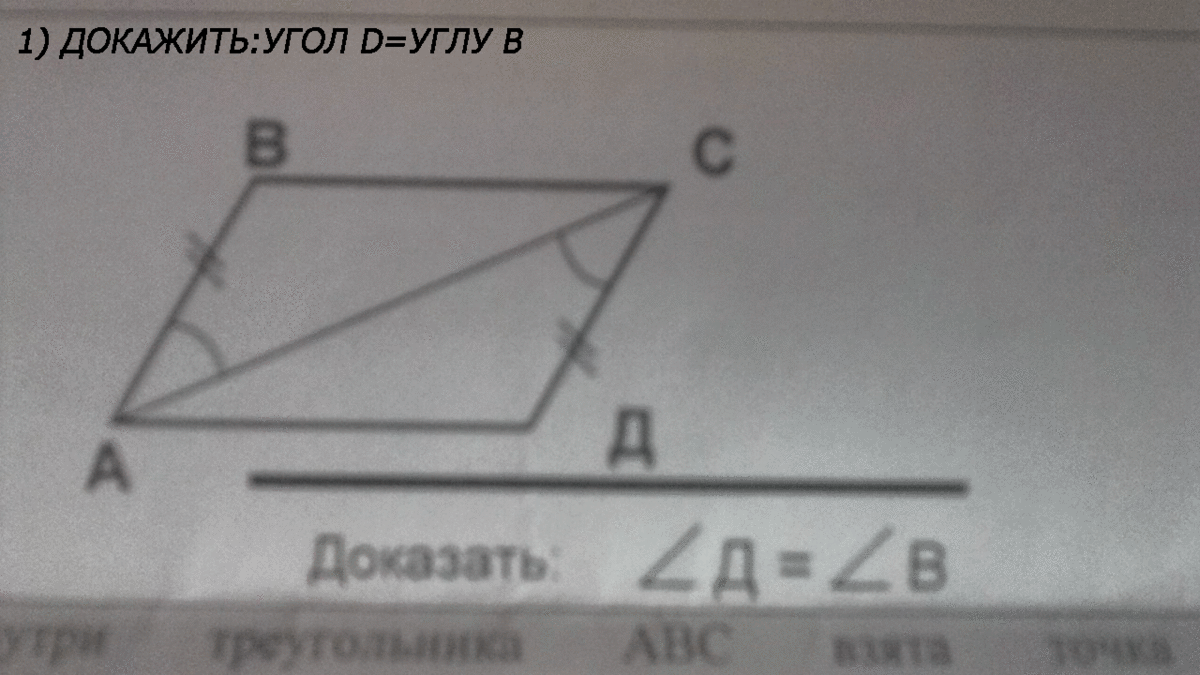 треугольник АВС = треугольнику СВД ( первый признак : угол ВАС=углу ДСА, АВ=СД, АС - общая), а т.к. треугольники равны ⇒угол В = углу Д