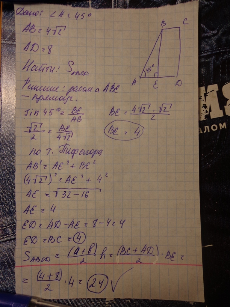 острый угол А прямоугольной трапеции равен АВСД равен 45 градусам.Большее основание трапеции равно 8 см,а большая бокавая сторона равна 4корень из2 см.найдите площадь трапеции