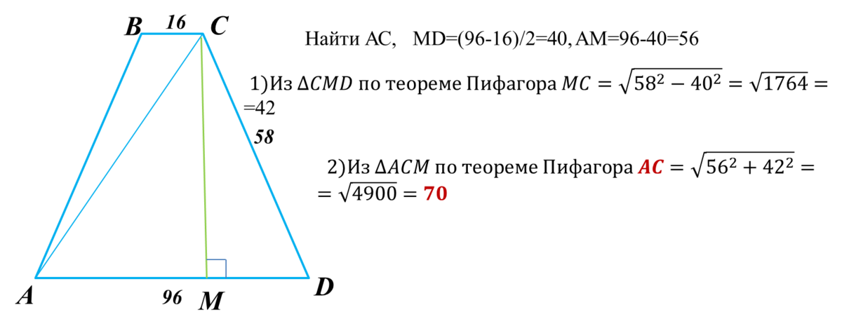 Основания равнобедренной трапеции равны 16 и 96, боковая сторона равна 58. Найдите длину диагонали трапеции.