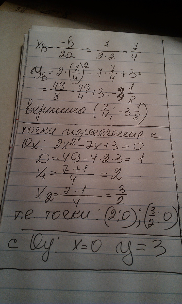 для параболы y=2x^2-7x+3 укажите вершины,точки пересечения с осью Оy и с осью Оx