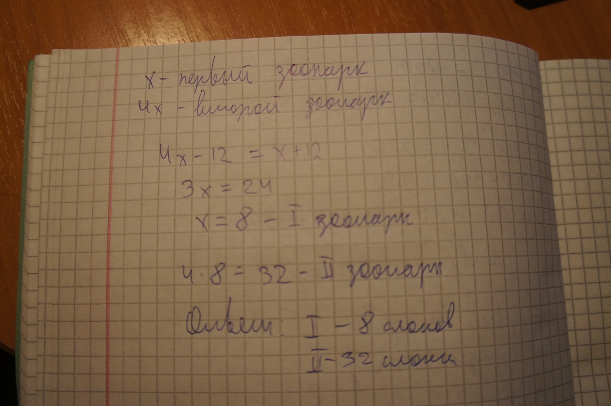 помогите мне пожалуйста решить задачу Решите задачу, выделив три этапа математического моделирование В одном зоопарке было в 4 раза меньше слонов ,чем в другом .Когда из второго зоопарка в первый перевезли 12 слонов,то слонов в зоопарках стало поровну.Сколько слонов было в каждом зоопарке первоначально ?