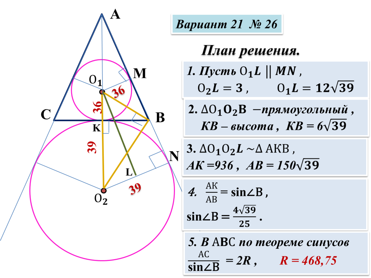 Две касающиеся внешним образом в точке K окружности, радиусы которых равны 36 и 39, касаются сторон угла с вершиной A. Общая касательная к этим окружностям, проходящая через точку K, пересекает стороны угла в точках B и C. Найдите радиус окружности, описанной около треугольника ABC.