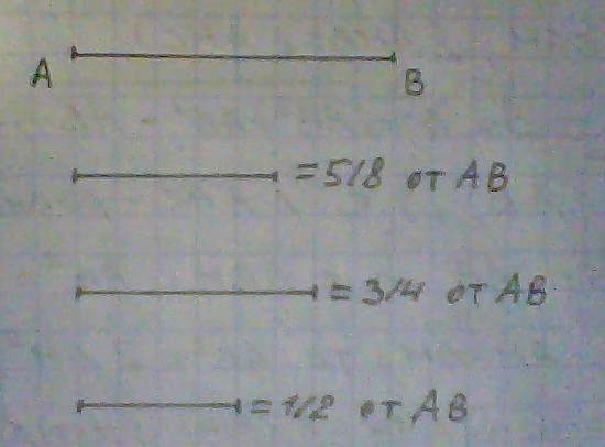 Решение в прикреплённом файле. В Вашем задании не дана длина отрезка, но это и не нужно, ведь можно от любого числа найти его дробные значения. Например. Берём отрезок длиной 8 см. 5/8 от него - это 5 см, 3/4 от него - это 6 см, 1/2 от него - это 4 см. И так с отрезком любой длины.