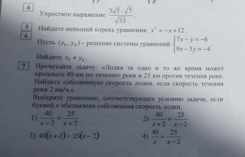 7)Прочитайте задачу:"Лодка за одно и тоже время может проплыть 40 км по течнию реки и 25 км против течения...."Выберите уравнение,соответствующее условию задачи,если буквой х обозначена собственная скорость лодки