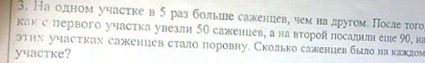 5х-50 =х+90 5х-х = 90 +50 4х = 140 х = 35 саженцев на втором участке