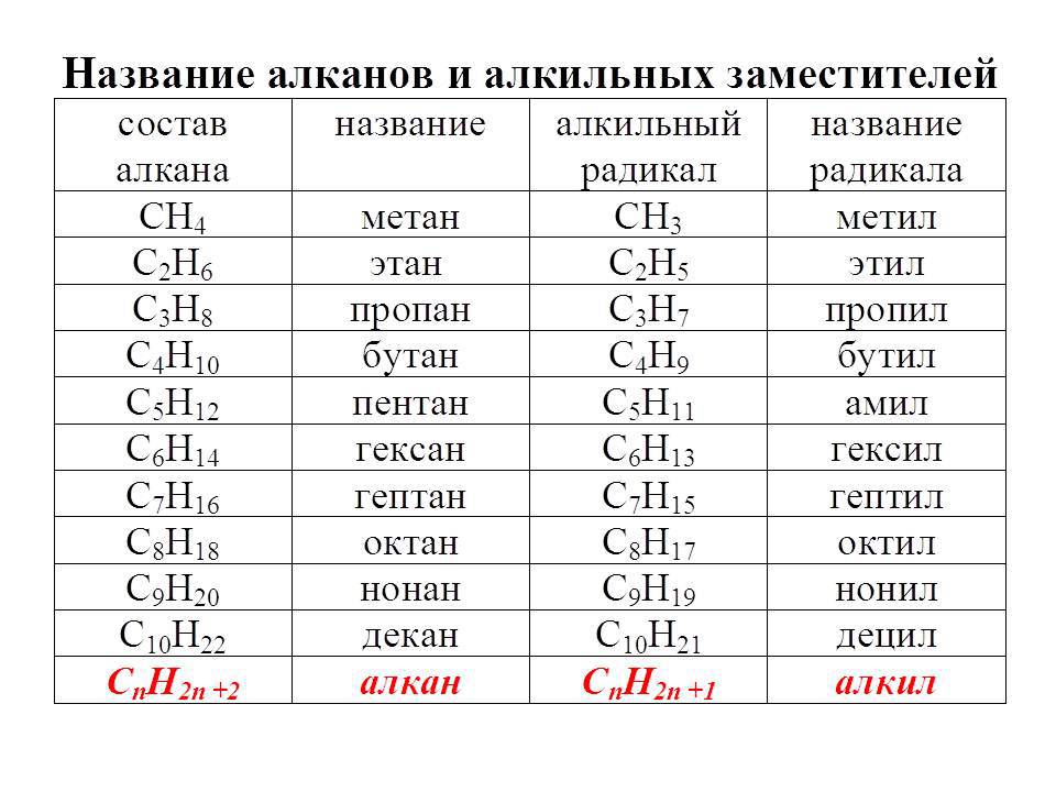 Если Вам надо примеров - эта таблица будет полезная. Все алканы всегда будет с суффиксом "-ан" а радикалы - с суффиксом "-ил".