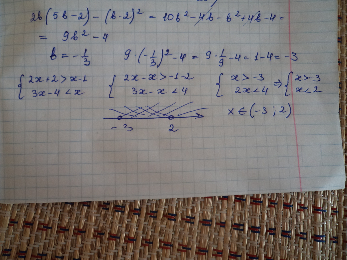 1.Упростите выражение: 2b (5b - 2) - (b - 2)^{2} и найдите его значение при b=-\frac{1}{3}. В ответе выпишите полученное число.