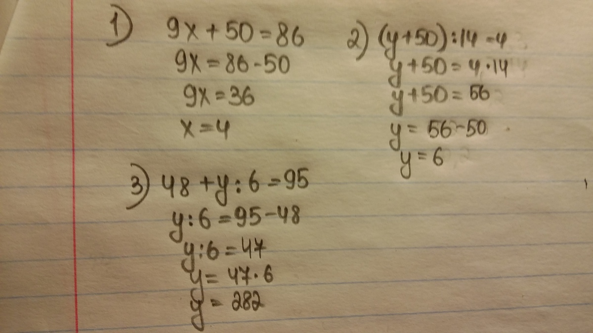 Помогите пожалуйста с уравнениями!1)9x+50=86,2) (y+50):14=4,3)48+y:6=95.Срочно!Заранее спасибо!