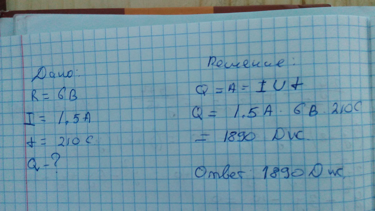 Напряжение резисторf 6 В. Сила тока 1,5 А. Найти количество тепла, выделяемого резистор в течение 3,5 минут