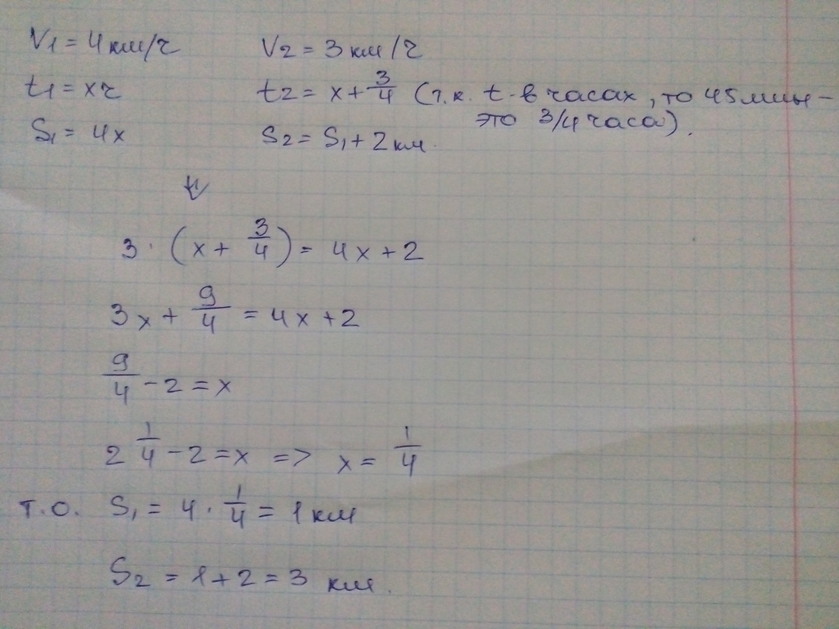Грибник шёл до леса полем со скоростью 4км/ч, а обратно возвращался по шоссе со скоростью 3км/ч, причём на обратную дорогу он затратил на 45 мин больше. Найдите путь грибника до леса и обратно, если дорога по шоссе на 2 км длиннее, чем дорога полем