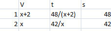 за х берем его собственную скорость, тогда можем составить таблицу из таблицы можем составить уравнение 48/(х+2) + 42/х = 6 одз х не равен -2 и х не равен 0