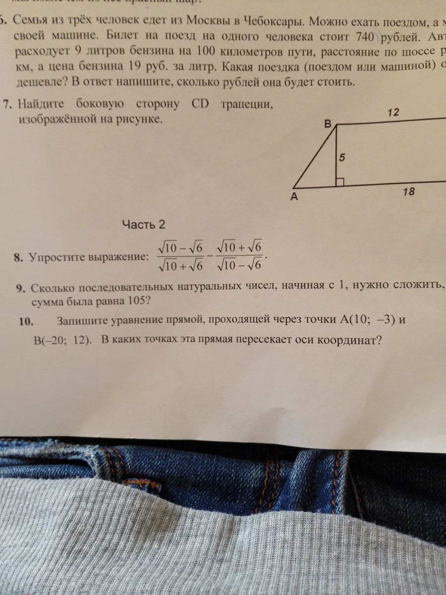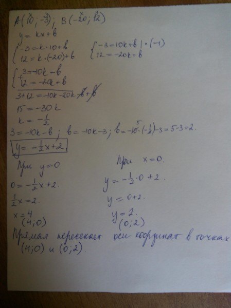 уравнение прямой y=kx+b. подставляешь x и y составляешь систему и решаешь ее. в уравнение подставляешь k и b. затем x и y приравниваешь к нулю и подставляешь. получаешь точки пересечения с осями
