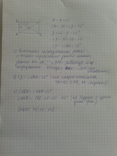 (Распишите решение) АВСД- прямоугольник угол АВД больше угла СВД на 20градусов. Найдите углы треугольника АОД, где о-точка пересечения.