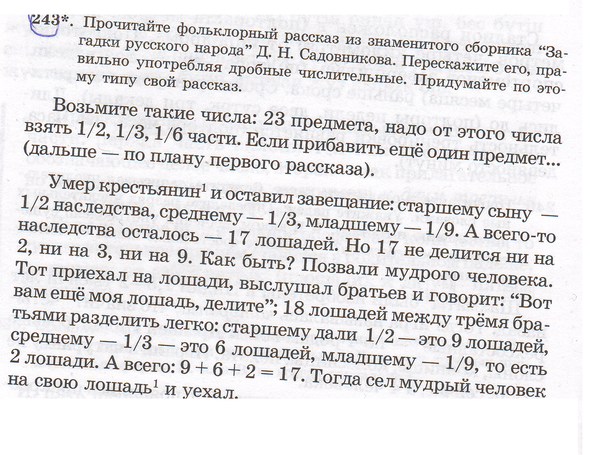 Умер крестьянин и оставил завещание: старшему сыну - одну вторую наследства, среднему - одну третью, младшему - одну девятую. А всего-то наследства осталось - семнадцать лошадей. Но семнадцать не делится ни на два, ни на три, ни на девять! Как быть? Позвали мудруго человека. Тот приехал на лошади, выслушал братьев и говорит : "Вот вам ещё моя лошадь,делите"; восемнадцать лошадей между трёмя братьями разделить легко: старшему дали - одну вторую - это девять лошадей, среднему - одну третью - это шесть лошадей, младшему - одну девятую, то есть две лошади. А всего девять плю шесть плюс два ровно семнадцать. Тогда сел мудрый человек на свою лошадь и уехал.