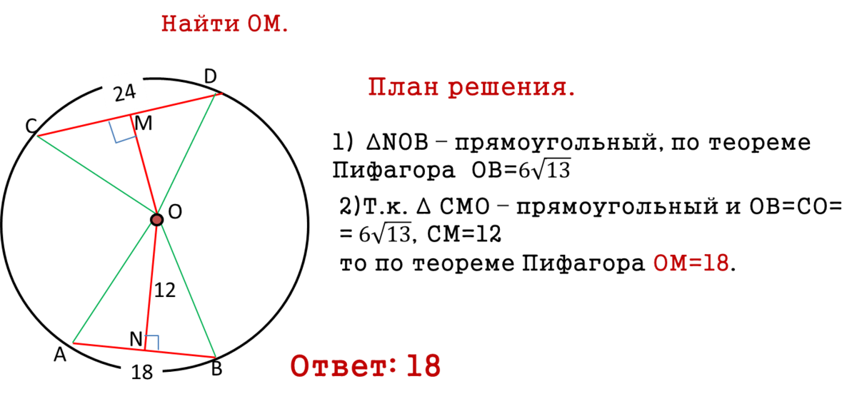 Отрезки AB и CD являются хордами окружности. Найдите расстояние от центра окружности до хорды CD, если AB = 18, CD = 24, а расстояние от центра окружности до хорды AB равно 12.