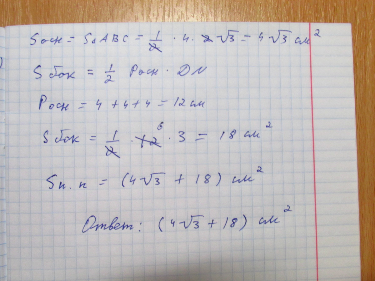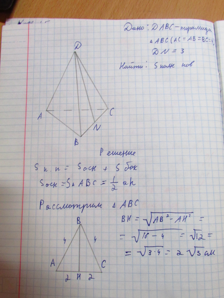 В правильной треугольной пирамиде сторона основания 4 см, апофема 3 см. Найдите площадь полной поверхности пирамиды.