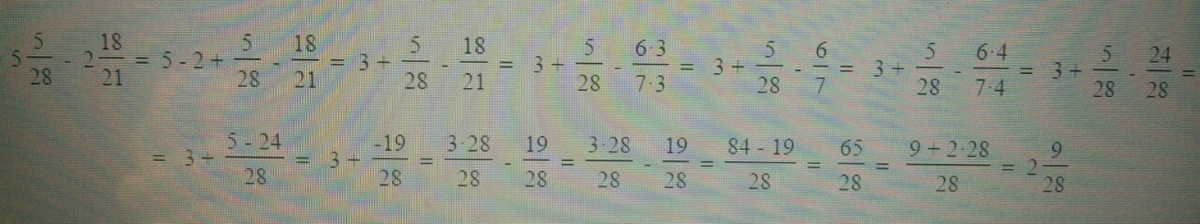 5 5/28 - 2 18/21 = 5 15/84 - 2 72/84 = 4 99/84 - 2 72/84 = 2 27/84 = 2 9/28