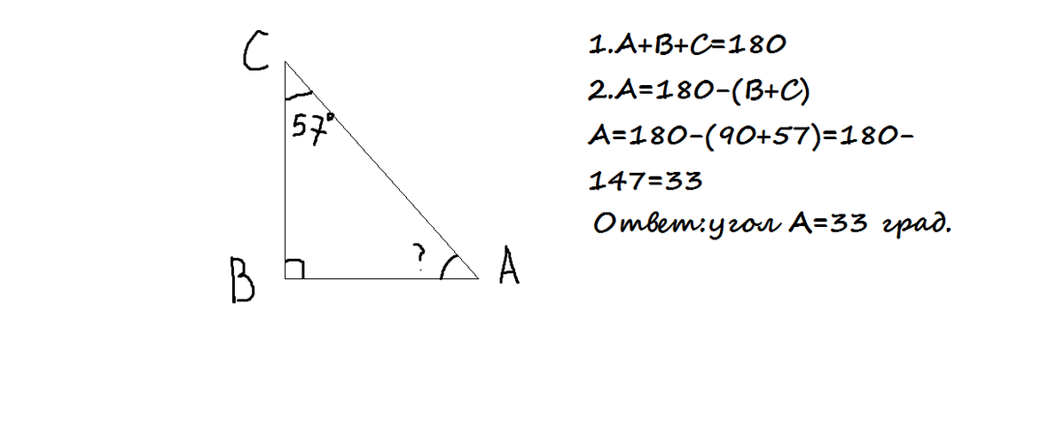 Один из острых углов прямоугольного треугольника равен 57 градуса. Найдите другой острый угол. Ответ дайте в градусах.