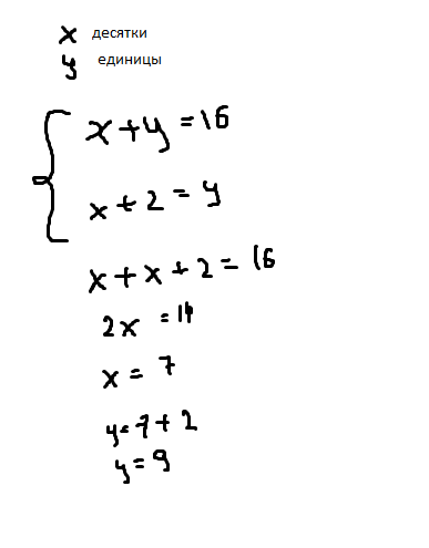 В двухзначном натуральном числе сумма цифр равна 16. Число десятков на 2 меньше числа единиц. Найдите это число