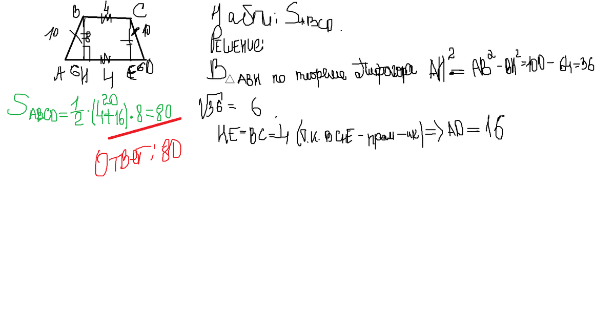 в равнобедренной трапеции ABCD основание BC=4 боковые стороны AB и CD=10 высота CH=8 найдите площадь трапеции