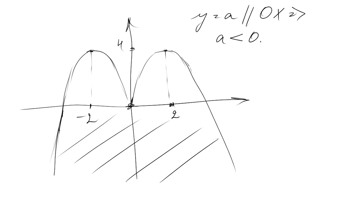 Заштриховано всё, что ниже оси Ох, мне просто лень было делать штриховку плотнее. То есть нам подойдут любые значения меньше нуля. И a=4 тоже подойдёт, да, это я в глаза немножко сношаюсь. y=a, a=4 => y=4. Всё правильно понимаешь. То есть, окончательный ответ: (-inf; 0) + {4}.