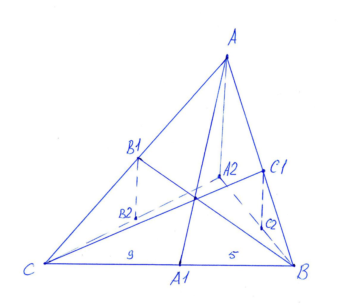 CB1/BC = CA1/CA; CB1 = 14*9/15; (или, то же самое, cos(C) =9/15 = 3/5; CB1 = 14*cos(C)); CB1 = 42/5;