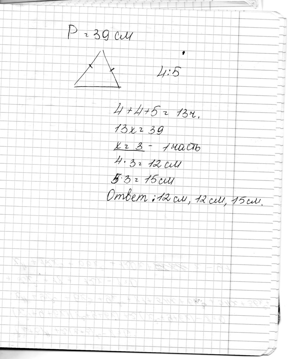 1. Периметр рівнобедреного трикутника 39 см, а бічна сторона відноситься до основи, як 4:5. Знайти сторони трикутника.