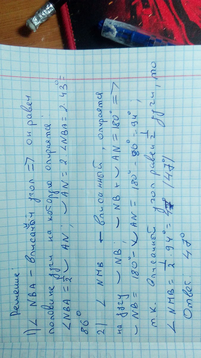 на окружности по разные стороны от диаметра АВ взяты точки М и N/ Известно что угол NBA=43 градуса. Найдите угол NMB/ Ответ в градусах.