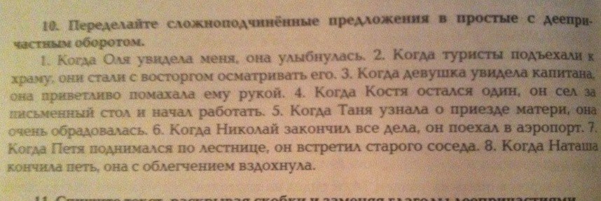 1)Оля,увидев меня, улыбнулась. 2)Туристы,подъехав к храму, стали с восторгом осматривать его. 3)Девушка, увидев капитана, приветливо помахала ему рукой. 4)Костя,оставшись один,сел за письменный стол и начал работать. 5)Таня,узнав о приезде матери,очень обрадовалась. 6)Николай, закончив все дела, поехал в аэропорт. 7)Петя,поднимаясь по лестнице, встретил старого соседа. 8)Наташа,кончив петь,с облегчением вздохнула.