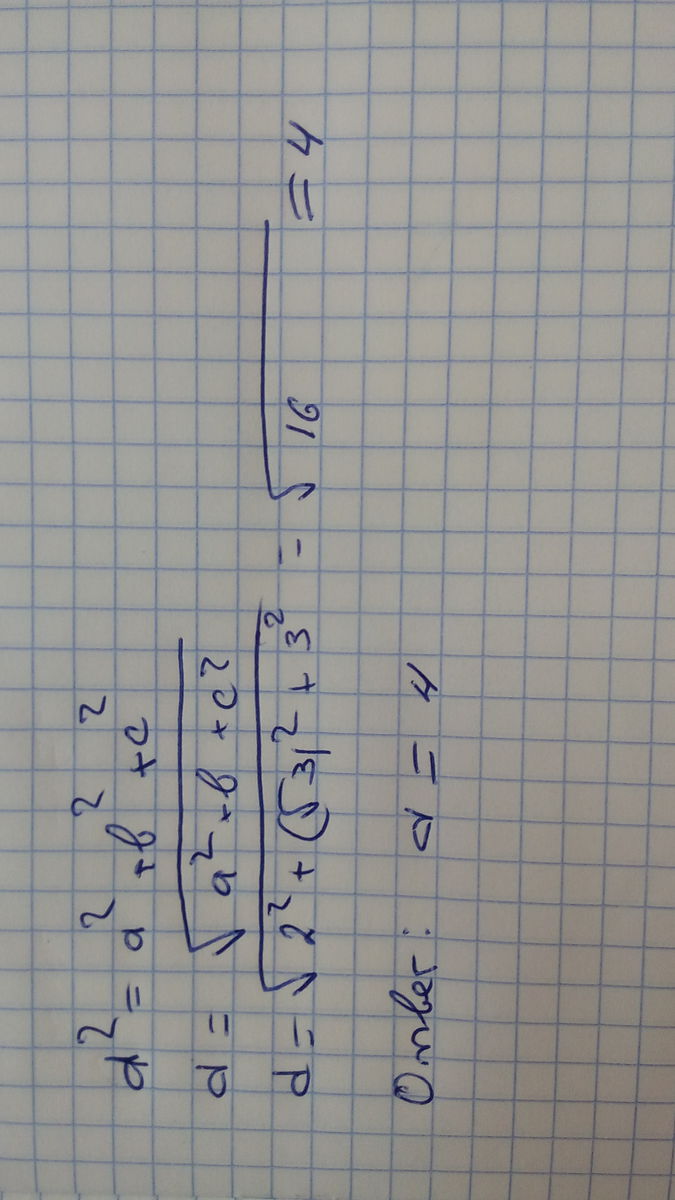 Найти длину диагонали прямоугольного параллелепипеда, если его измерения равны 2, корень из 3, 3