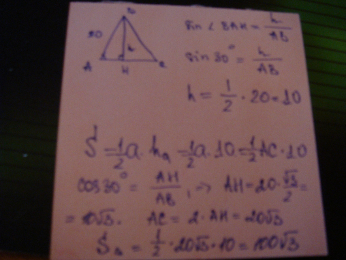 Осевое сечение конуса - равнобедренный треугольник со стороной 20м(образующая) и углом при основании 30, тк отбразущая наклонена к плоскости основания по углом 30. Задача свелась к нахождению высоты и площади равнобедренного трегольника.