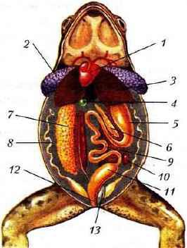 1. сердце. 2. легкое. 3. печень. 4. желчный пузырь. 5 . желудок. 6.поджелудочная железа. 7. яичник. 8. яйцевод. 9.тонкая кишка . 10.селезёнка. 11.толстая кишка. 12. клоака. 13. мочевой пузырь